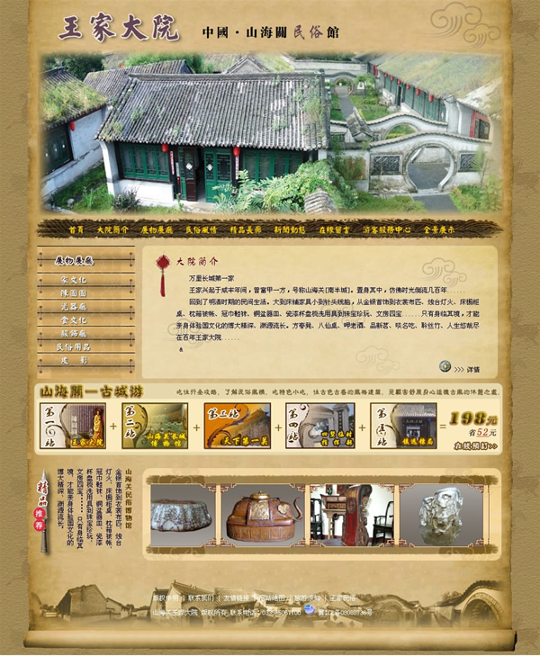 回到了明清時期的民間生活。大到床鋪家具小到針頭線腦,從金銀首飾到衣裳布匹、燭臺燈火、床櫥柜桌、枕箱被帳、冠巾鞋襪、銅盆器皿、瓷漆杯盤梳洗用具到珠寶珍玩、文房四寶......只有身臨其境,才能親身體驗國文化的博大精深、淵源流長。方春凳、八仙桌、呷老酒、品新茗、啖名吃、聆絲竹、人生悠哉盡在百年王家大院......