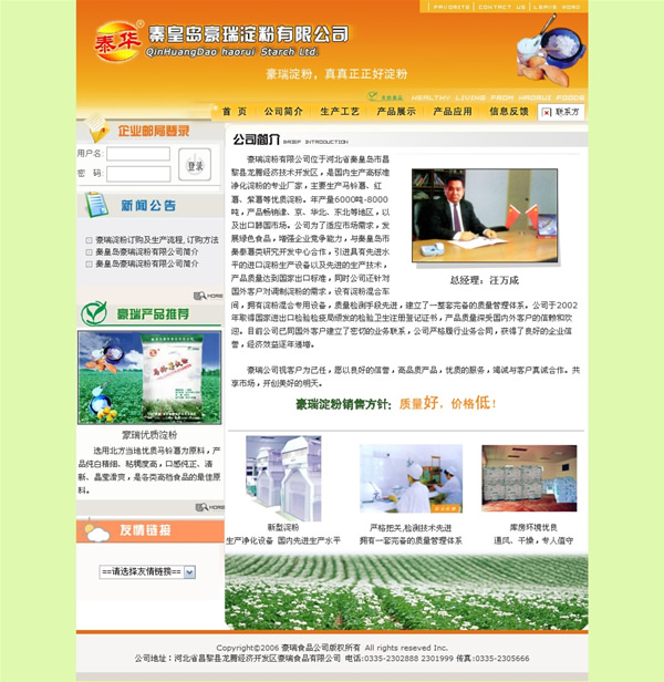 豪瑞淀粉有限公司位于河北省秦皇島市昌黎縣龍騰經(jīng)濟(jì)技術(shù)開發(fā)區(qū),是國內(nèi)生產(chǎn)高標(biāo)準(zhǔn)凈化淀粉的專業(yè)廠家,主要生產(chǎn)馬鈴薯、紅薯、紫薯等優(yōu)質(zhì)淀粉。年產(chǎn)量6000噸-8000噸,產(chǎn)品暢銷津、京、華北、東北等地區(qū),以及出口韓國市場。公司為了適應(yīng)市場需求,發(fā)展綠色食品,增強(qiáng)企業(yè)競爭能力,與秦皇島市秦泰薯類研究開發(fā)中心合作,引進(jìn)具有先進(jìn)水平的進(jìn)口淀粉生產(chǎn)設(shè)備以及先進(jìn)的生產(chǎn)技術(shù),產(chǎn)品質(zhì)量達(dá)到國家出口標(biāo)準(zhǔn),同時(shí)公司還針對國外客戶對調(diào)制淀粉的需求,設(shè)有淀粉混合車間,擁有淀粉混合專用設(shè)備,質(zhì)量檢測手段先進(jìn),建立了一整套完備的質(zhì)量管理體系。公司于2002年取得國家進(jìn)出口檢驗(yàn)檢疫局頒發(fā)的檢驗(yàn)衛(wèi)生注冊登記證書,產(chǎn)品質(zhì)量深受國內(nèi)外客戶的信賴和歡迎。目前公司已同國外客戶建立了密切的業(yè)務(wù)聯(lián)系,公司嚴(yán)格履行業(yè)務(wù)合同,獲得了良好的企業(yè)信譽(yù),經(jīng)濟(jì)效益逐年遞增。